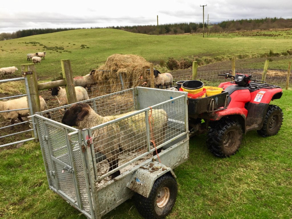 This year the weather is much warmer and not quite as wet as our last lambing season. The average high has been in the mid-40’s, with a couple of days in the 50’s. While there have only been three or four sunny days, we haven’t had nearly as much rain as we did two years ago. Although, as I type this, the whole country is under a weather warning from Storm Brendan, which is bringing 130 km/hr winds and flooding rain. Feeding in the fields this morning was sporty.