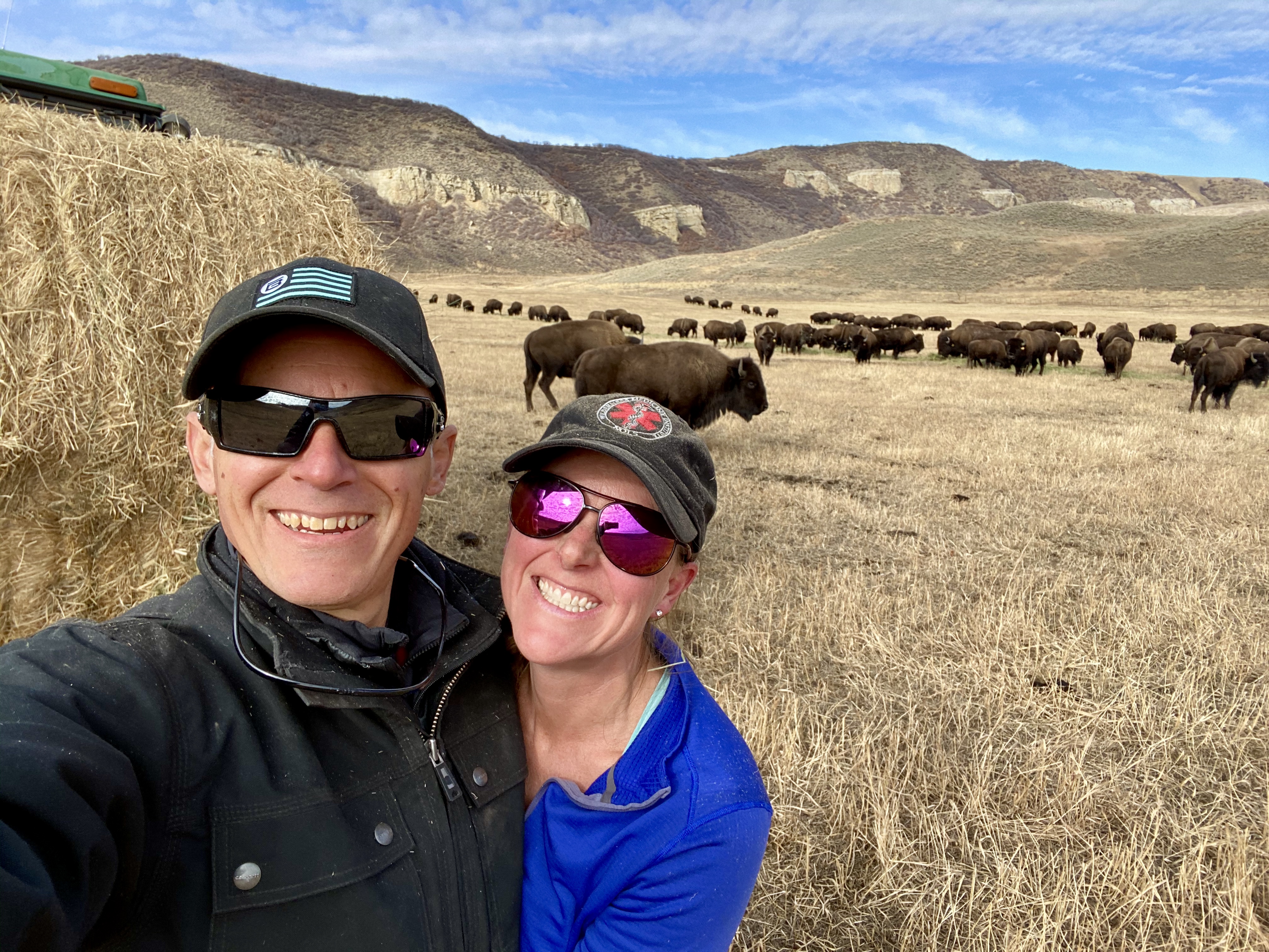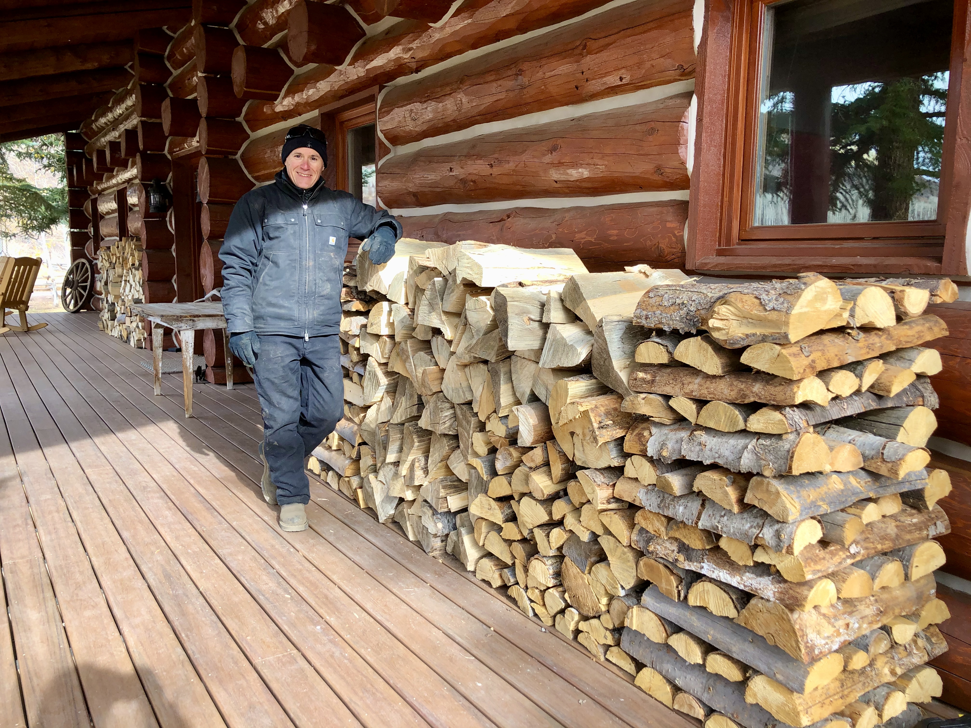 We spent the fall busting our butts: cutting, collecting, splitting, and stacking cords of firewood, re-finishing log decking, painting, and deep cleaning the home and cabins, and we learned to feed the 120 bison and 16 horses. It was hard physical labor getting ready for all that winter was to bring — we enjoyed it for nearly three months before the weather changed.